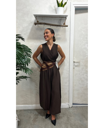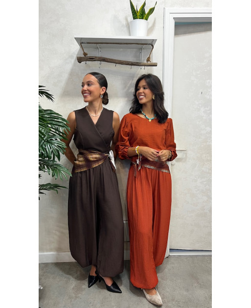 pantalón bombacho fabricado una talla única pero es válido desde la talla S hasta la talla L. Las medidas son de 38 cm tirando hasta los 65 cm un pantalón bastante amplio que vale casi todas las tallas. Incorpora a modo decoración un pañuelo que está en tendencia